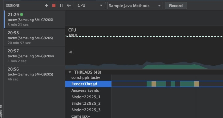 CPU, Memory를 중점적으로 봤고, 그 중 CPU가 다른 화면과 달리 좀더 사용하는 것이 확인되었습니다. 특히 RenderThread가요…