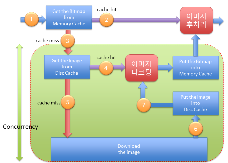 - Disk Cache Hit의 경우, “이미지 디코딩”을 한 후 Memory에 캐싱, “이미지 후처리”를 거쳐 사용자에게 보여진다.