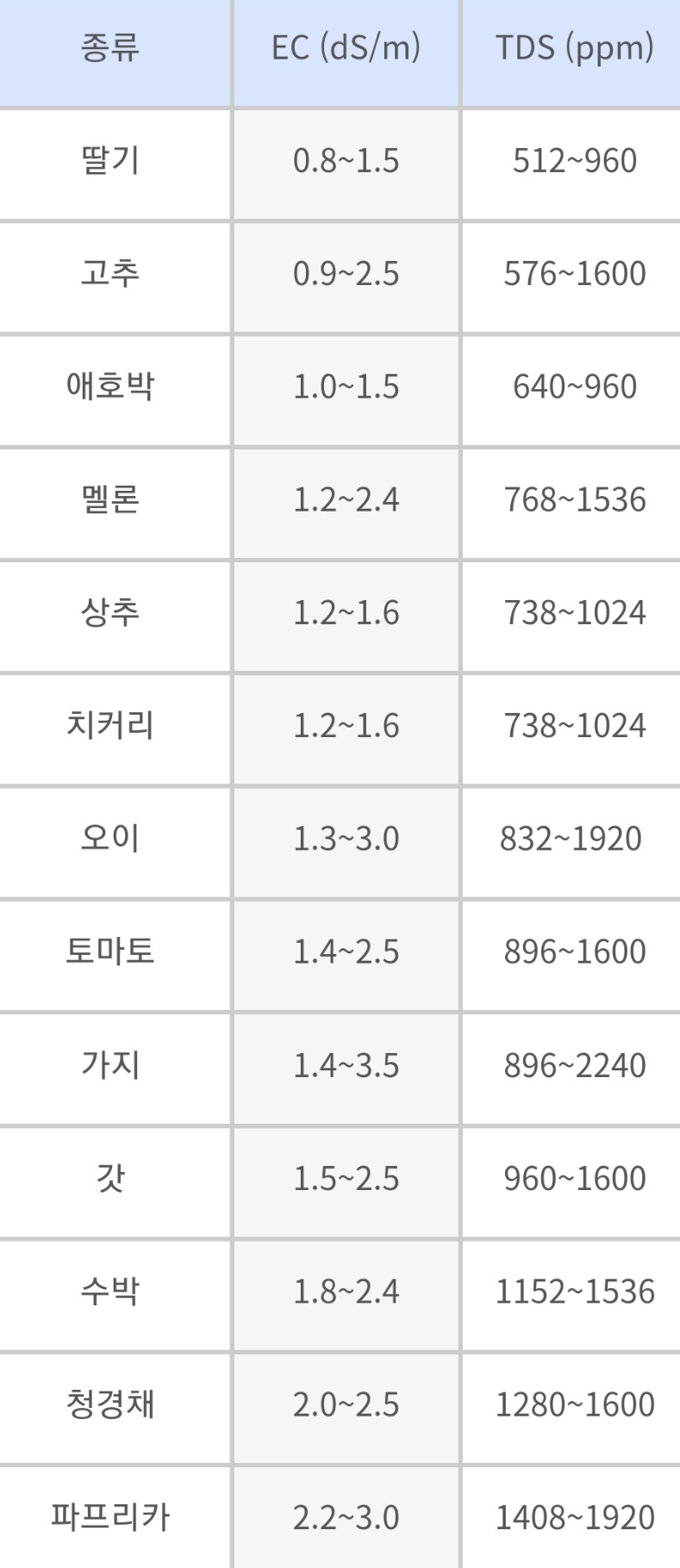 식물들이 자라는데 적합한 ppm 수치입니다.