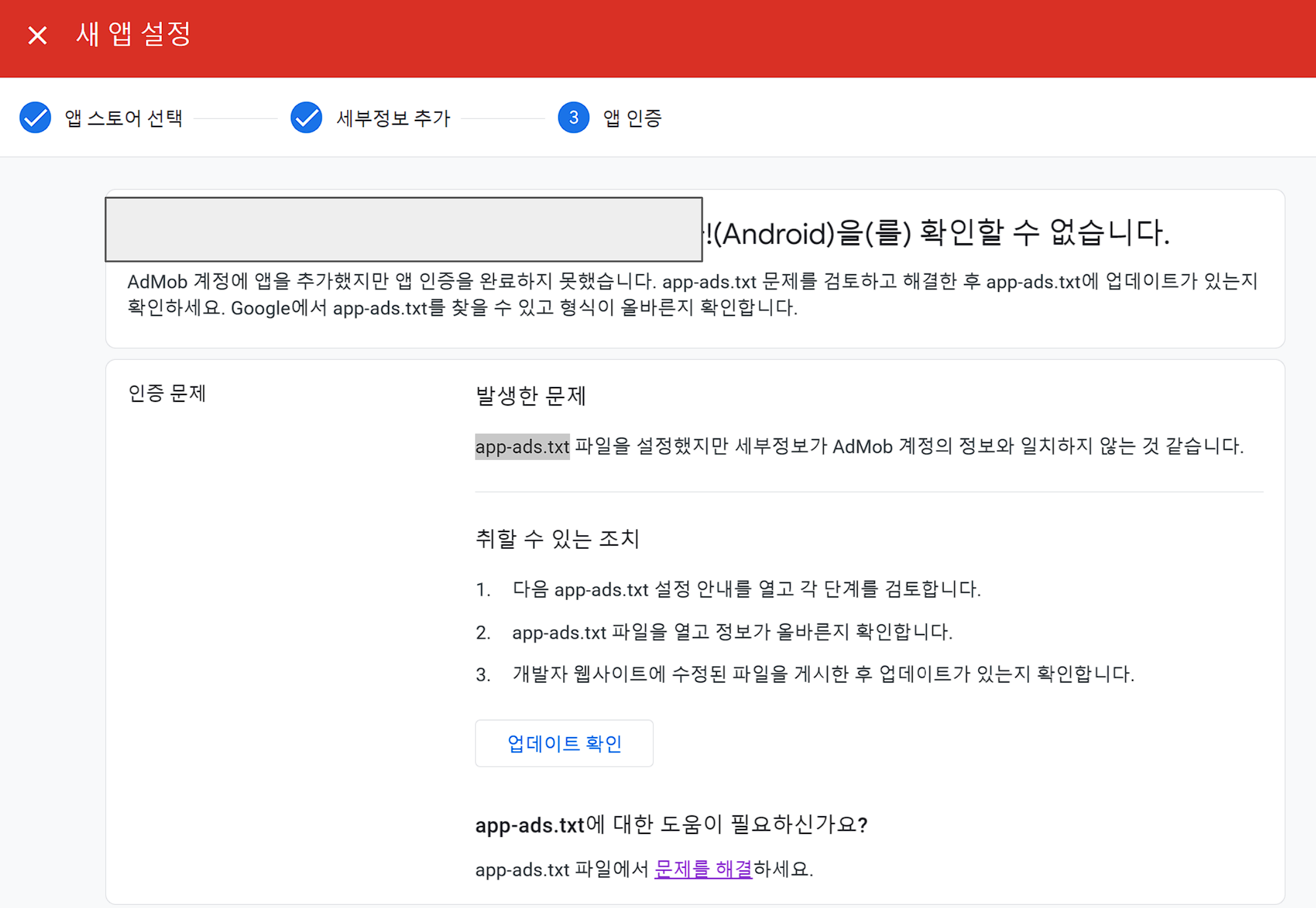 그런데 최근 애드몹 설정을 추가하려고 보니 app-ads.txt 를 찾을 수 없다며 진행이 불가한 상태가 되었습니다.