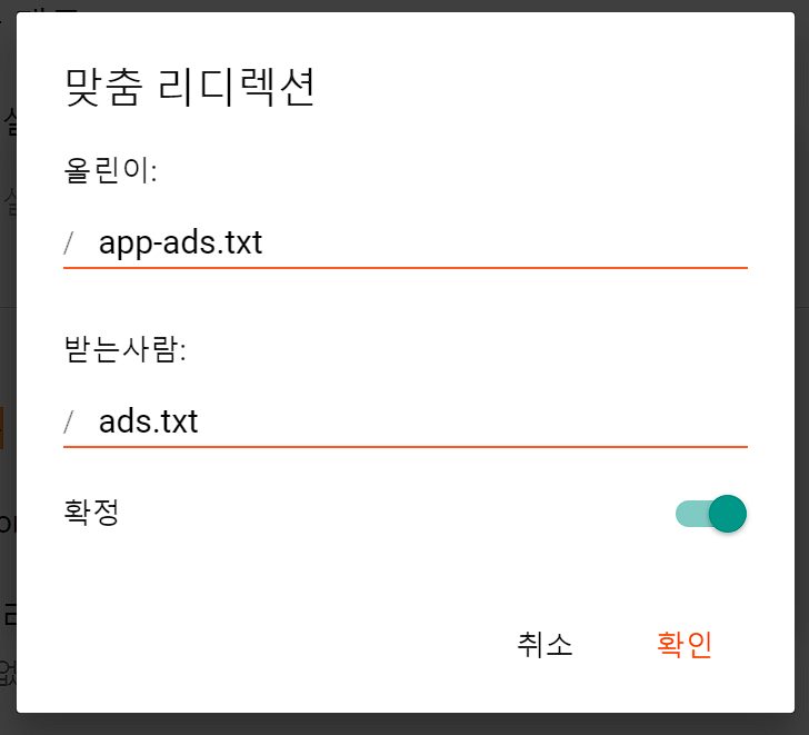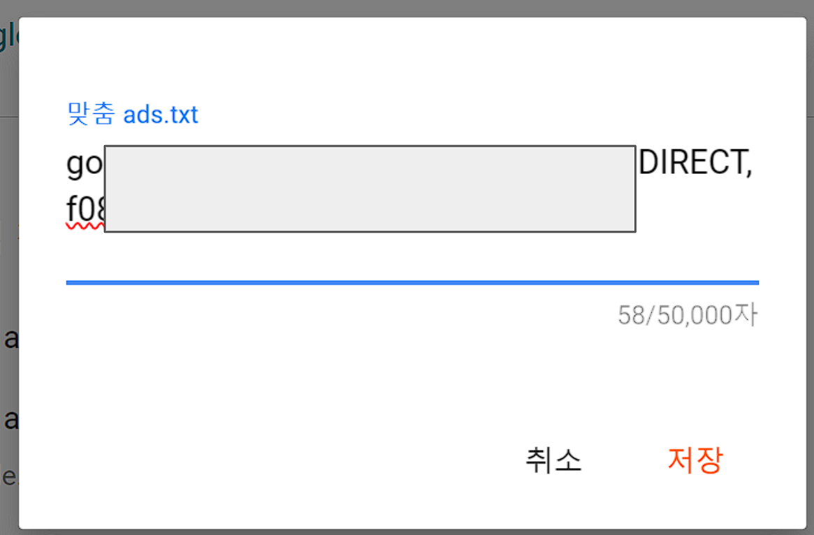 아래와 같이 "맞춤 ads.txt" 를 클릭하면 열리는 팝업 창에 텍스트를 입력해야 합니다.