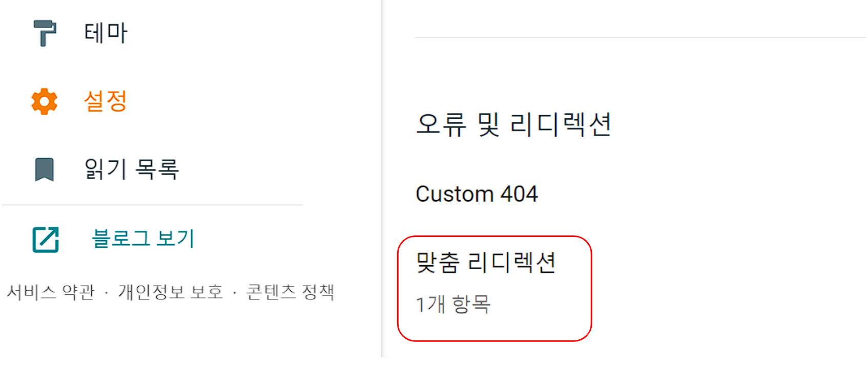 이제 다시 설정 화면 내에서 "오류 및 리디렉션" 세션을 찾아주세요