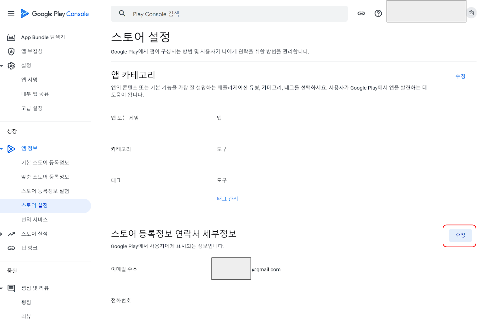 스토어 등록정보 연락처 세부정보 영역이 있습니다.